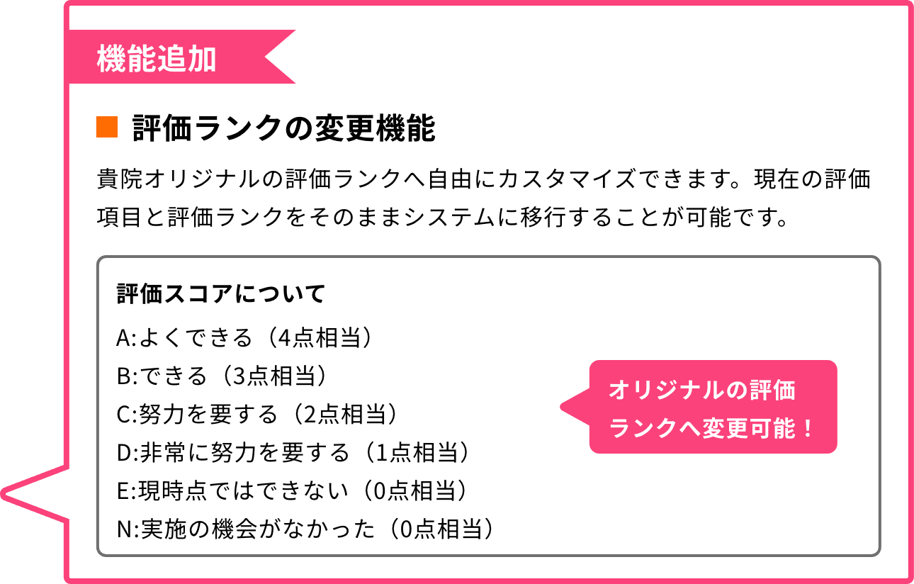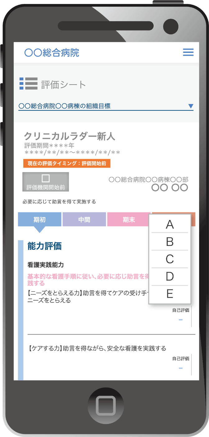 2023 年6 月に日本看護協会が公開した「看護実践能力習熟段階( ラダー)」に合わせて標準的な評価シートを用意していますが、貴院オリジナルの評価シートを追加して自由にカスタマイズすることもできます。 「委員会」「外部研修の受講」「資格」等も記録して保管可能です。