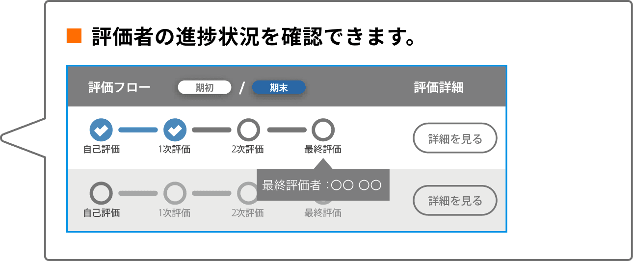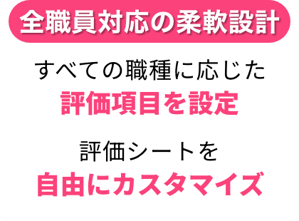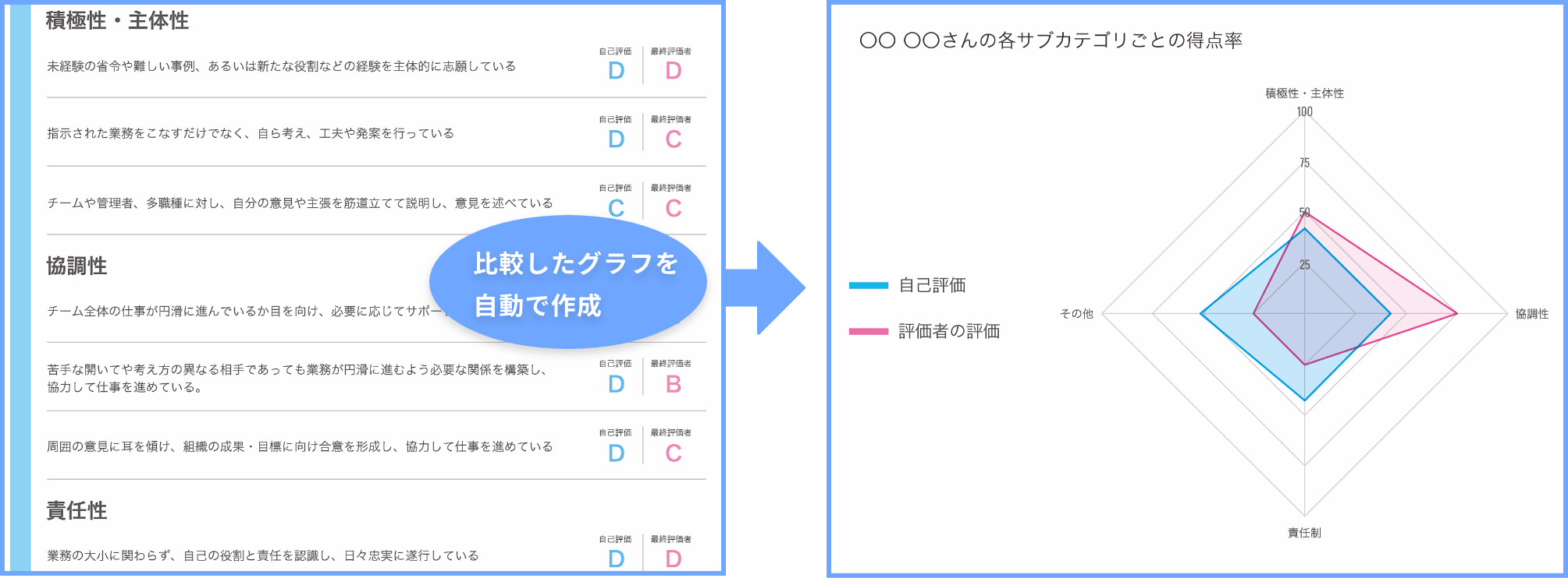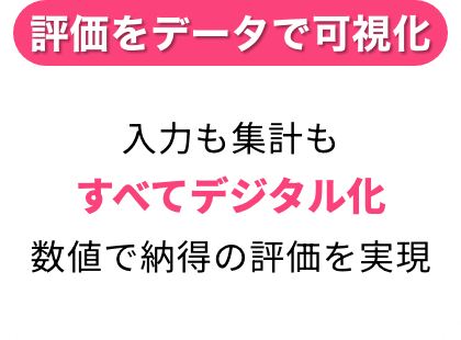 ユーザーはPC・スマートフォンからアクセスして、評価シートの入力が可能です。評価結果が自動でデータ化・集計されるので、記入用紙の配布・収集・データ入力の手間を無くし、管理者や、評価者の負担を減らします。