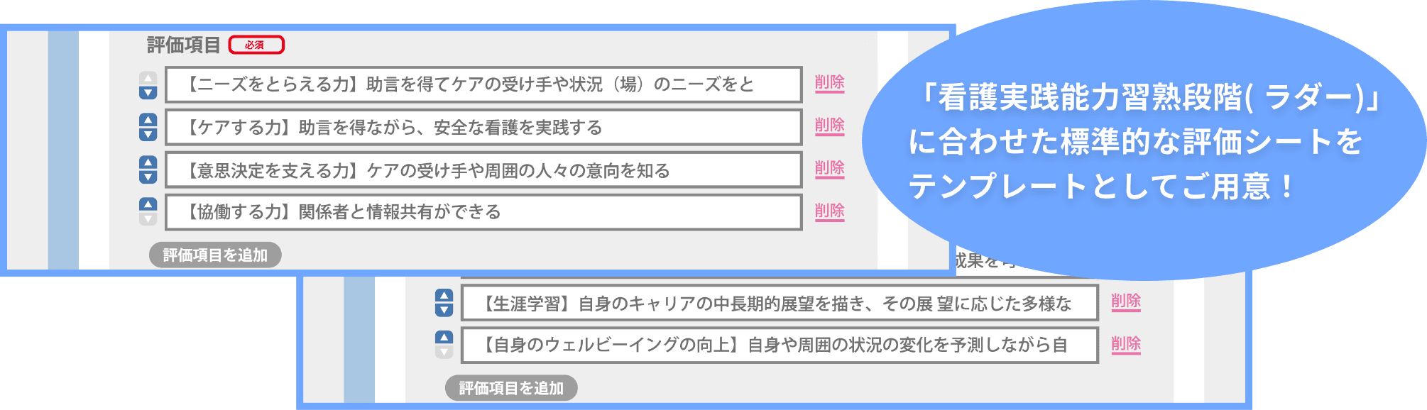 「看護実践能力習熟段階( ラダー)」に合わせた標準的な評価シートをテンプレートとしてご用意!
