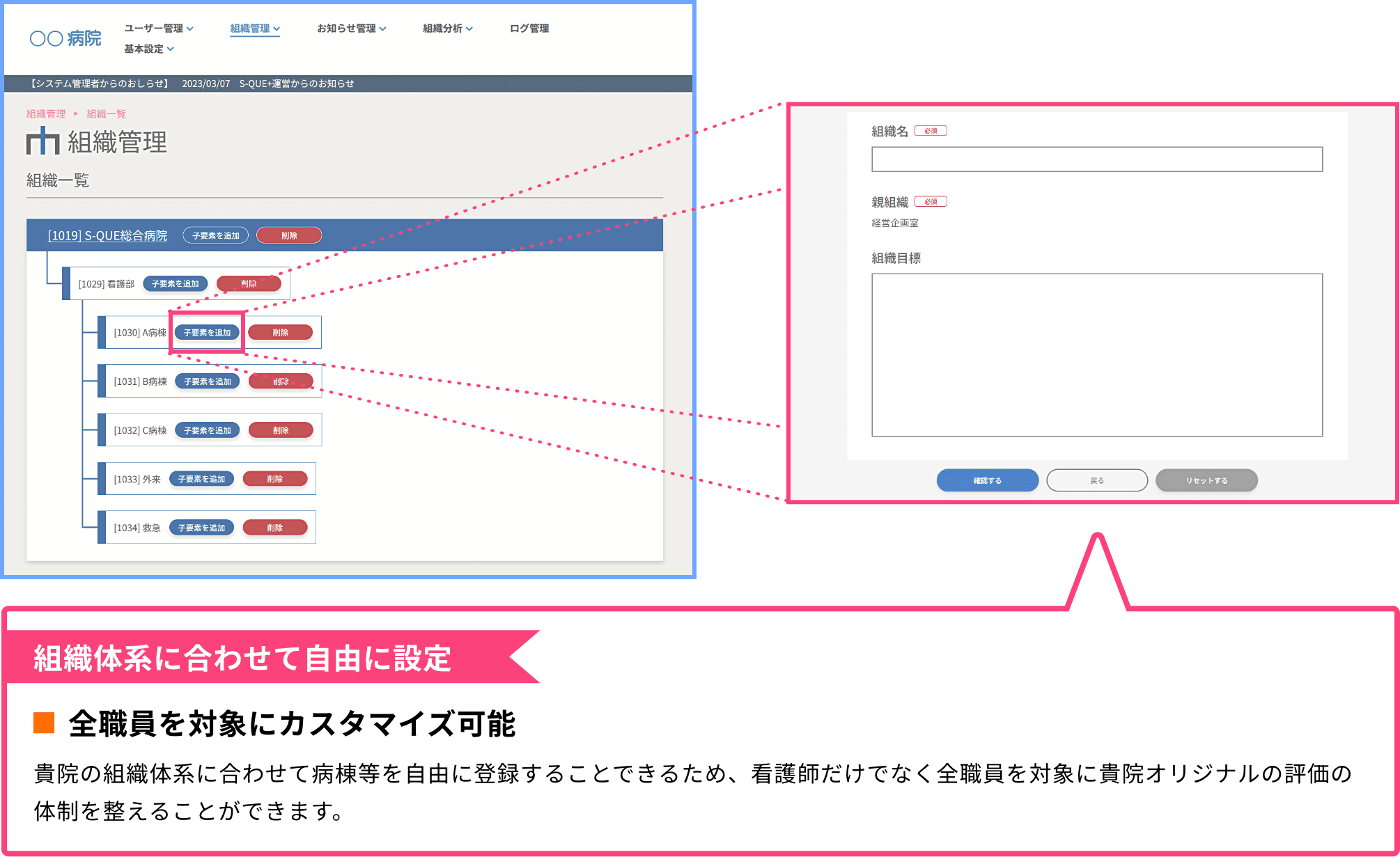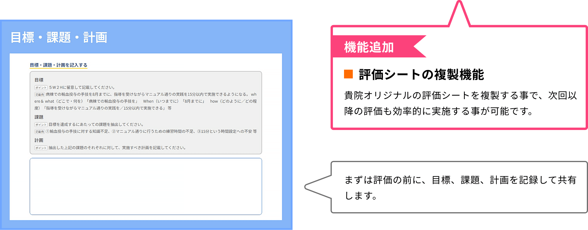 創業以来、教育研修サービスを提供している当社は、「看護職員の労働環境」の改善が日本の医療現場での大きな課題であると感じています。そこで、私たちは看護の人事評価・管理の際に根強く残っている「紙の文化」に着目して、テクノロジーを用いて看護現場の業務軽減ができるスマホでかんたん「S-QUE 人事評価」を展開していきます。「S-QUE 人事評価」は、看護職員自身が目標や到達度の自己評価をスマートフォンで入力し、上長が一人ひとりのスキルや成果、努力を可視化して把握することで、客観的な人事評価、人事異動の指標に用いることができます。さらに評価項目を自由に設定できるため、看護師だけでなく全職員を対象に人事評価を行うことができます。