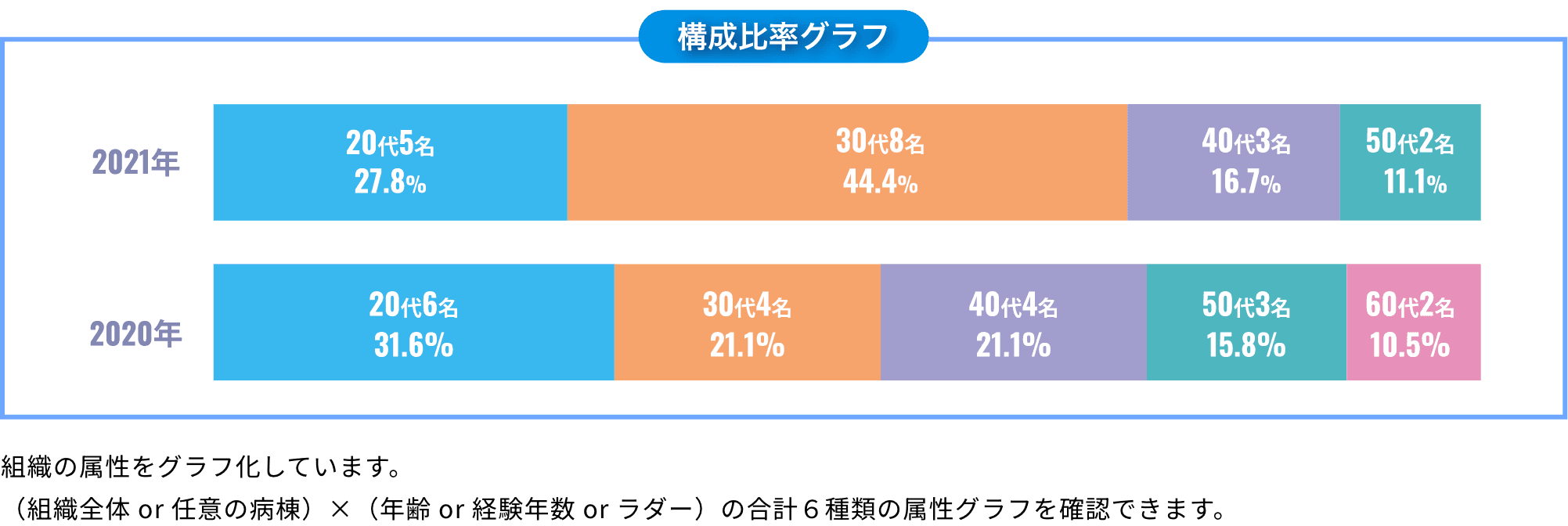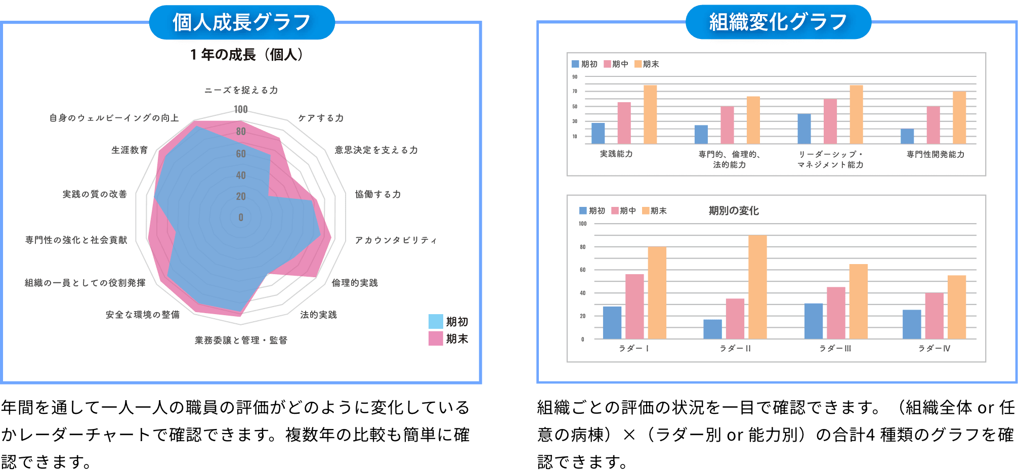 個人、病棟、部署ごとの評価の状況をグラフで簡単視える化することができ、年間比較、経年比較で評価の変遷を確認できます。